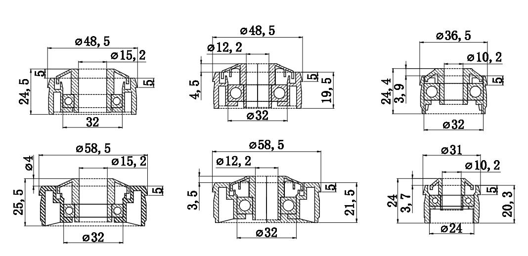 | Diameter | 32 | 38 | 38 One-piece | 50 | 50 One-piece | 51 | 60 | 60 One-piece | 76 |
